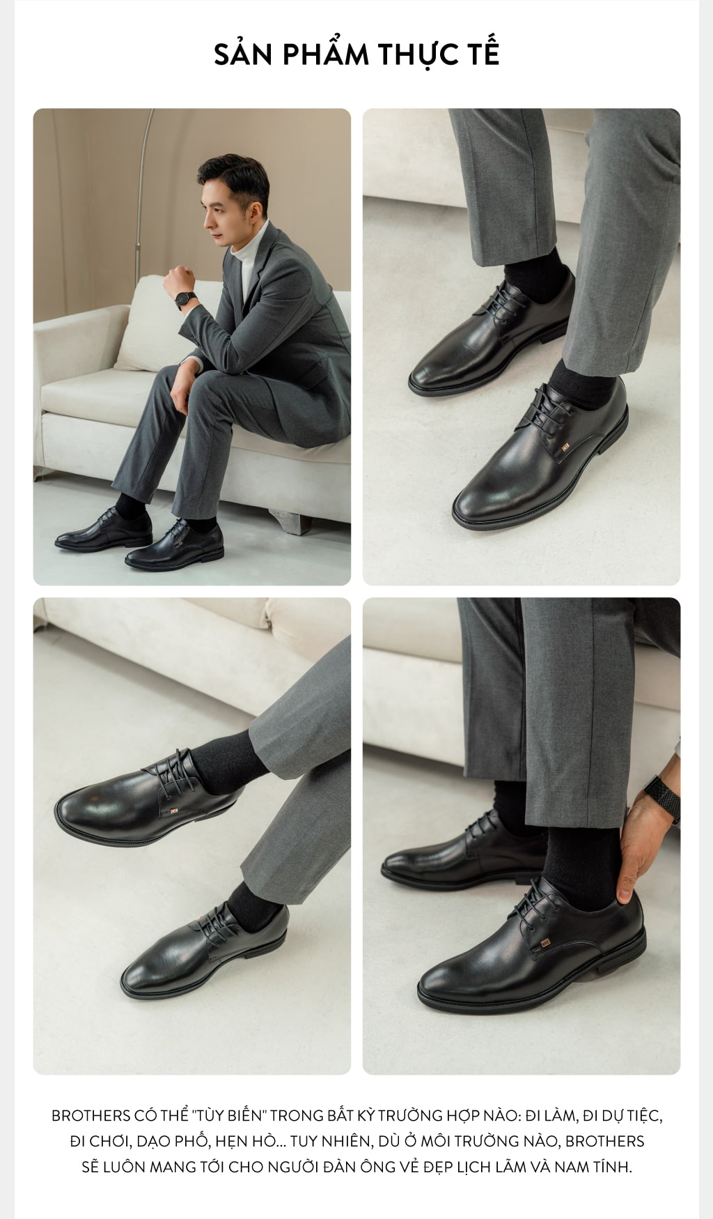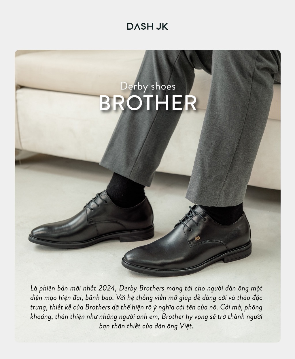 BROTHERS – Đen là mẫu giày buộc dây đặc trưng cho dòng Derby với 2 phần dây mở. Bề mặt da có độ sần nhất định đặc trưng, tạo điểm nhấn mạnh mẽ, phóng khoáng.Bởi vậy vừa giữ được tính chất của 1 đôi Derby quen thuộc, vừa thể hiện được sự mới mẻ, phá cách đầy nam tính. Phiên bản màu đen là một lựa chọn an toàn và linh hoạt cho mọi dịp.
