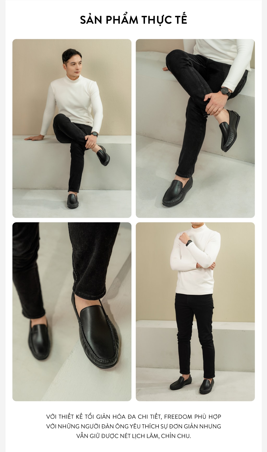 FREEDOM – Đen là mẫu giày lười mang đặc trưng của dòng Moccasins không đế. Mẫu giày với chất liệu siêu mềm, thiết kế ôm chân, basic, mang tới cảm giác tự do, thoải mái, phù hợp với những người đàn ông yêu thích sự đơn giản nhưng vẫn giữ được nét lịch lãm, chỉn chu.