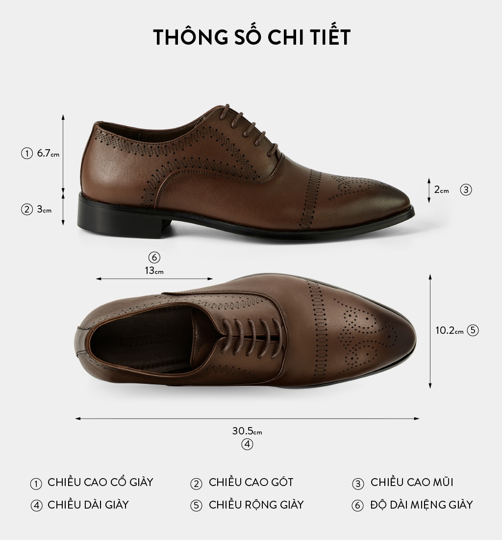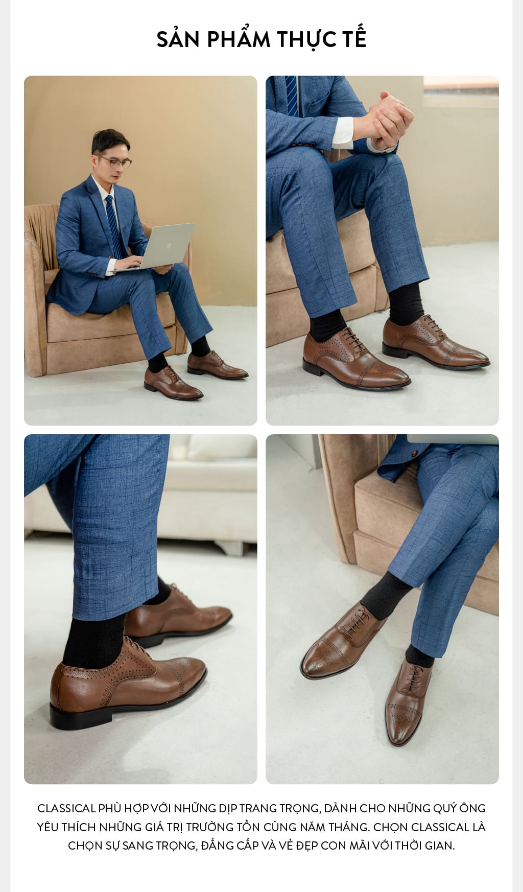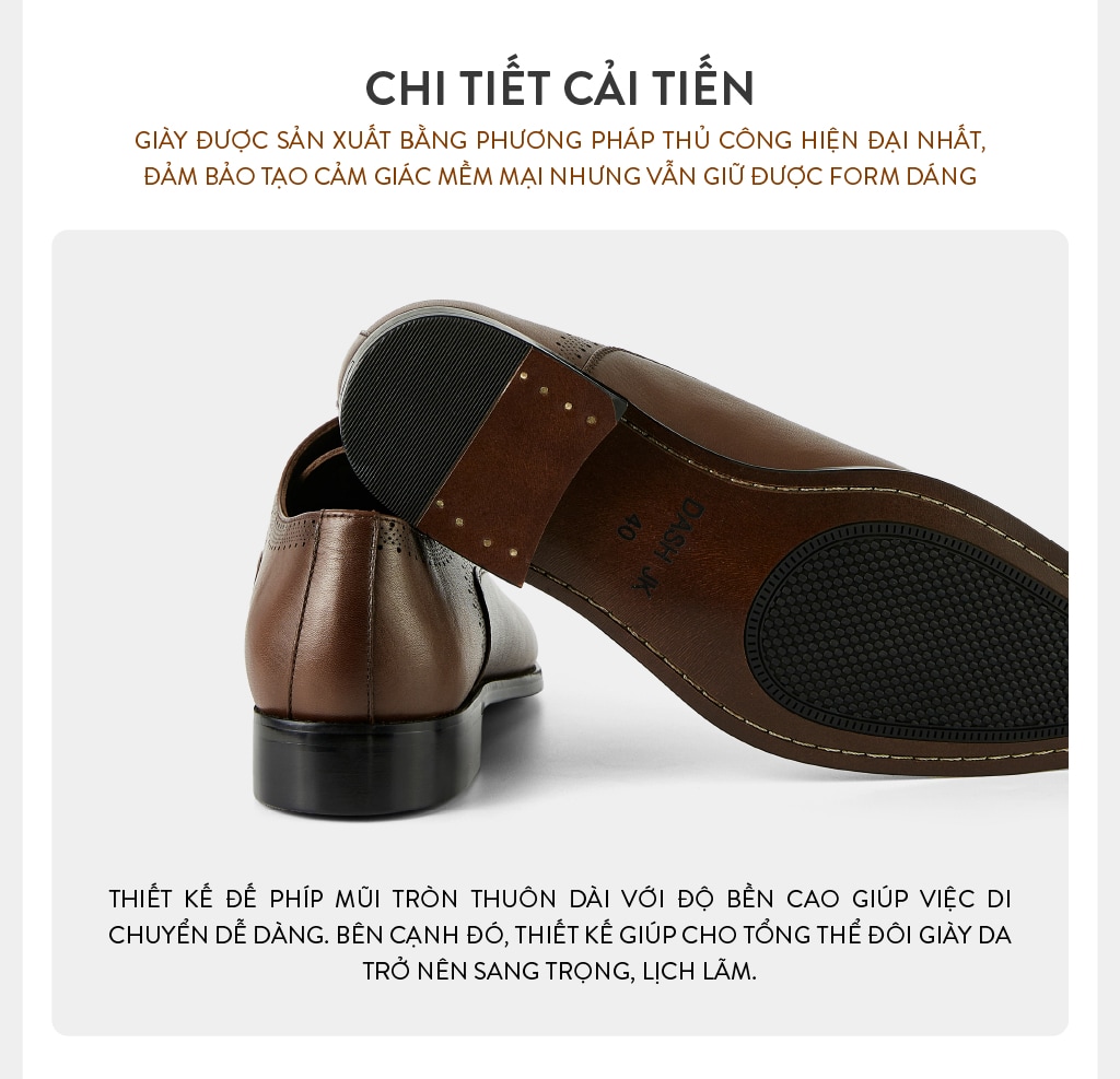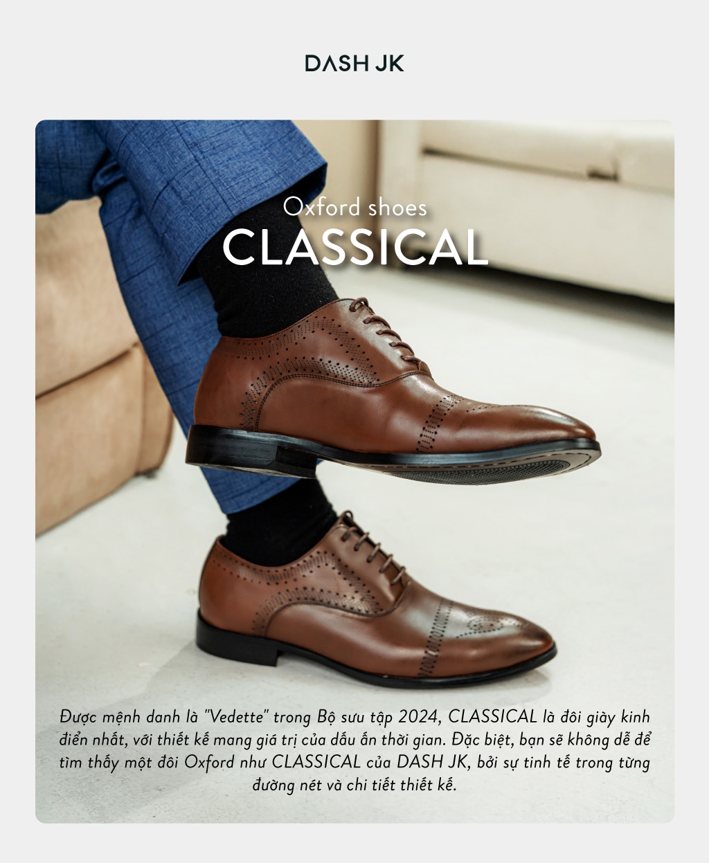 Classical là mẫu giày buộc dây đặc trưng cho dòng giày kinh điển Oxford được thiết kế theo chuẩn mực quốc tế. Mũi giày với họa tiết đục lỗ kết hợp cùng đế phíp tinh tế và sang trọng, phù hợp với những quý ông yêu thích những giá trị trường tồn, phù hợp cho những dịp trang trọng. Phiên bản CLASSICAL – Nâu mang lại lựa chọn mới mẻ và thời thượng cho mọi dịp.